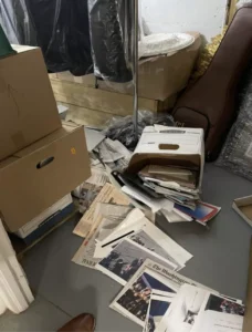 A later picture shows papers spilling from a box that appears to have fallen over in the storage room.
