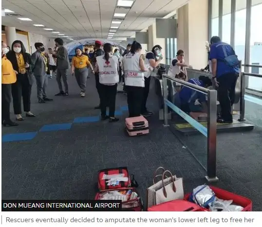 Rescuers had too amputate the leg of a woman stuck in an airport travelator (moving pavement) to save her. She got stuck in Bangkok’s Don Mueang airport.