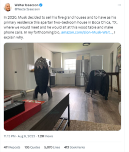 Musk’s biographer Walter Isaacson recently tweeted a picture of the billionaire’s humble “spartan two-bedroom house” on X, formerly known as Twitter.