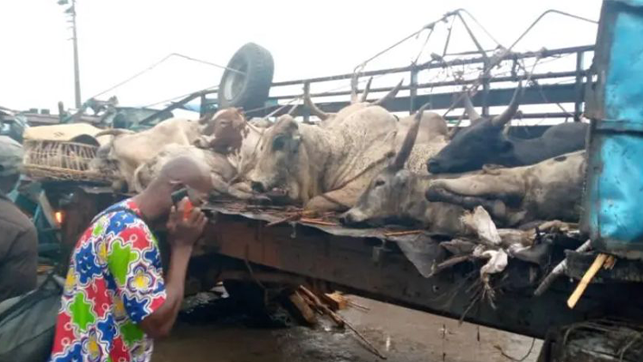 Seven people were injured in an accident involving a Volvo truck carrying cows, and two other vehicles on the Lagos -Ibadan Expressway on Saturday.