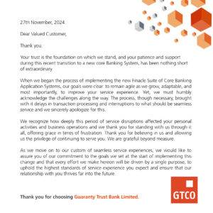One of Nigeria’s leading commercial banks, Guaranty Trust Bank (GTBank), has tendered a formal apology to its customers for delays and disruptions in transaction processing caused by its recent system upgrade.