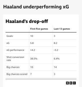 City have a lengthy injury list, but their downturn has coincided with Haaland’s struggles in front of goal.