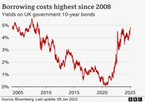 Line chart showing 10-year UK government bond yields, from 2004 to January 2025. The yield was 4.9% on 2 January 2004, and rose to a peak of 5.5% in July 2007. It then gradually fell to a low of 0.1% in August 2020, before starting to climb again. On 9 January 2025, it hit 4.9%, the highest since 2008.
