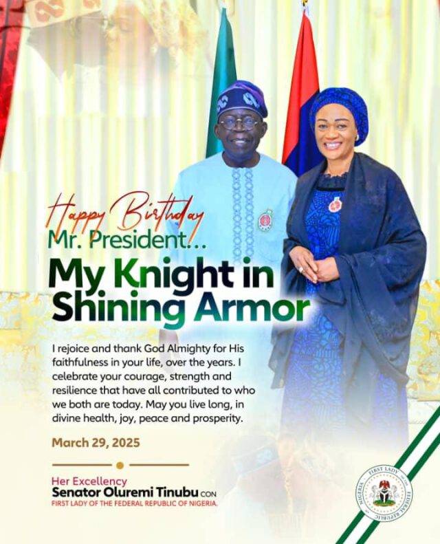 Nigeria’s First Lady, Senator Oluremi Tinubu, has conveyed heartfelt compliments to President Bola Ahmed Tinubu, GCFR, on his 73rd birthday, on Saturday.