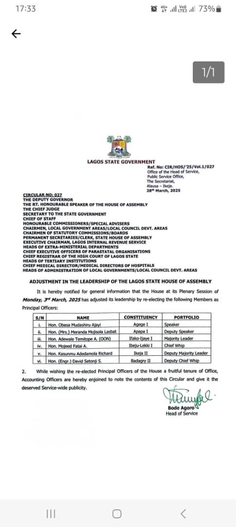 The circular emphatically confirmed Obasa as the speaker of the legislative arm and Hon. Meranda Lasbat as the deputy speaker: Hon. Adewale Temitope as the majority leader: Hon. Mojeed Fatai as the Chief Whip: Hon. Kasunmu Adedamola Richard as Deputy Majority Leader and Hon. David Setonji as the Deputy Chief whip.