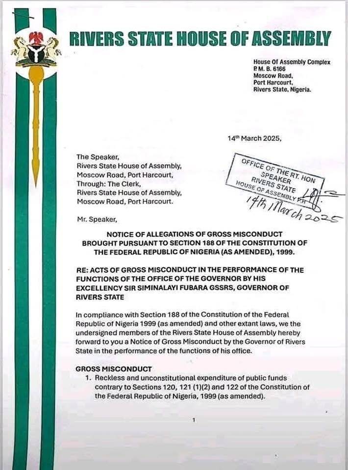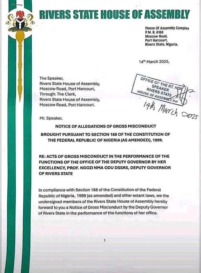 “In compliance with Section 188 of the Constitution of the Federal Republic of Nigeria, 1999 (as amended) and other extant laws, we the undersigned members of the Rivers State House of Assembly hereby forward to you a Notice of Gross Misconduct by the Deputy Governor of Rivers State in the performance of the functions of her office,” the notice read.