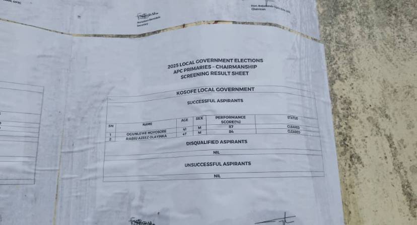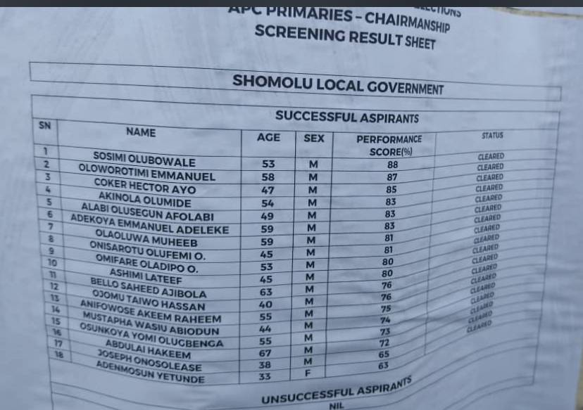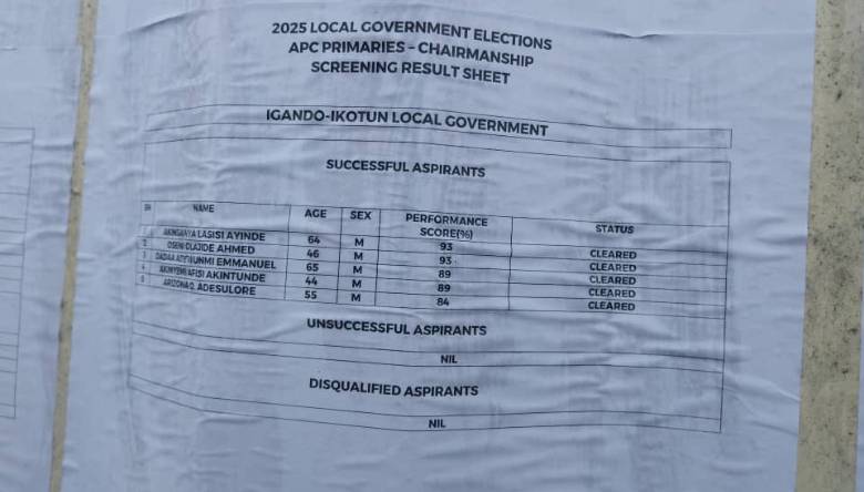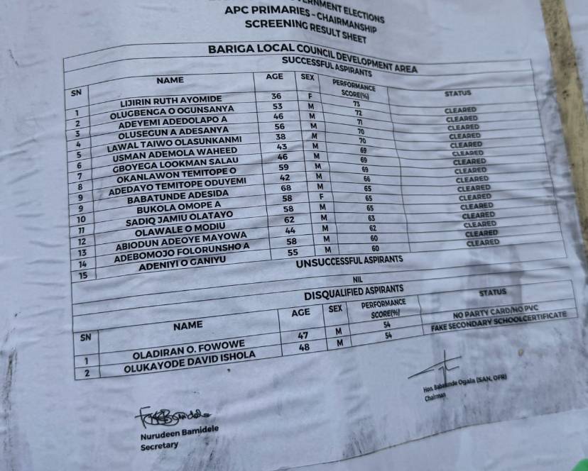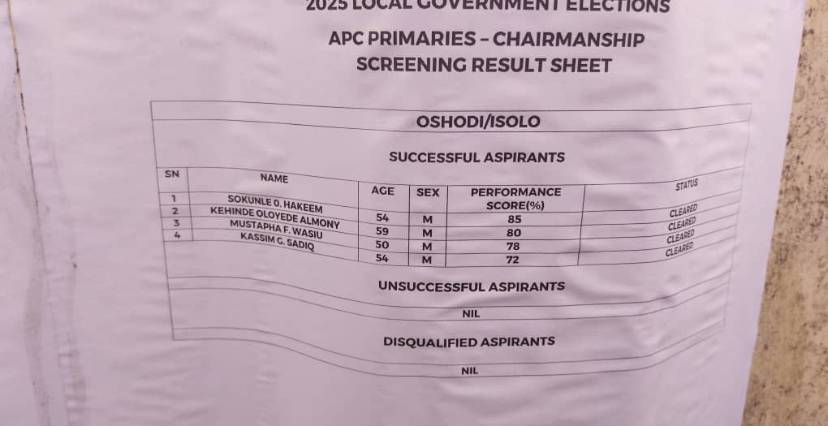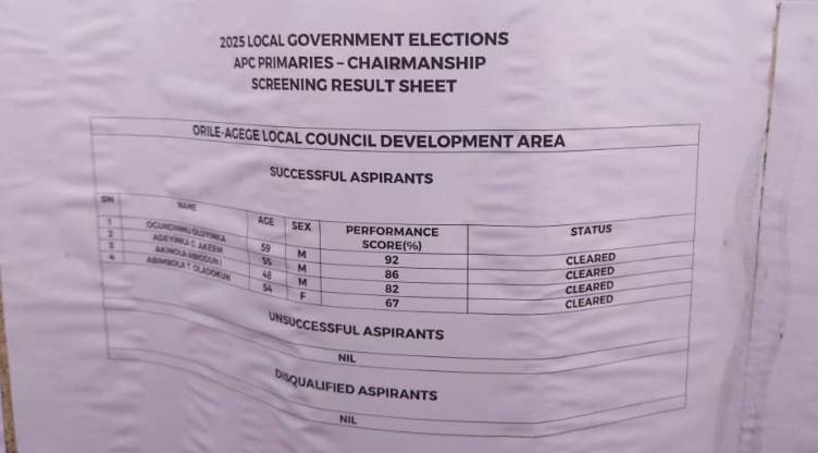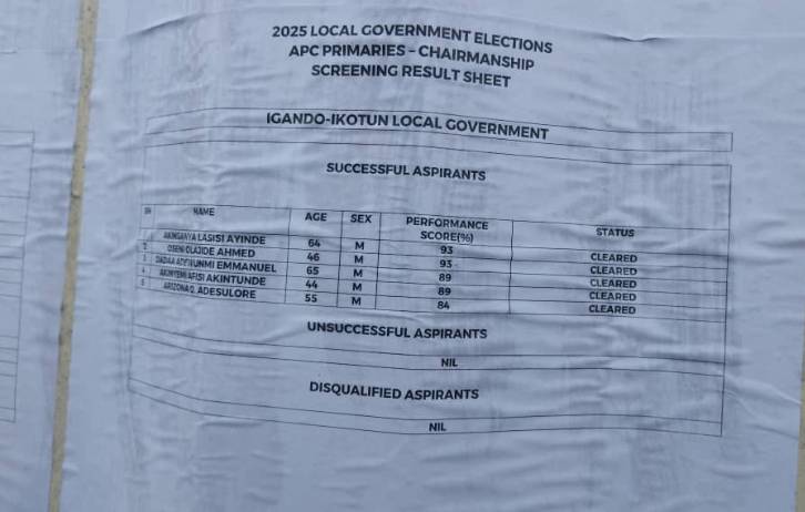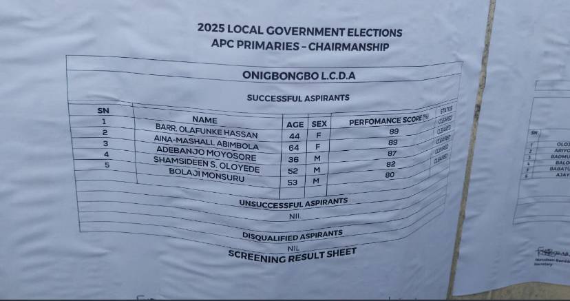 The Barr. Babatunde Ogala-led Electoral Committee of the All Progressives Congress (APC) in Lagos State has released the result of the screening exercise conducted for Chairmanship aspirants vying to flag the party’s flag across the 57 LGAs and LCDAs in the state come July 12, 2025.
