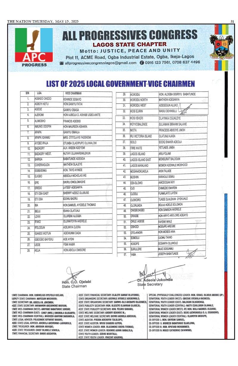 The Lagos State chapter of the All Progressives Congress (APC) has finally released the list of its vice chairmanship candidates for the July 12 local government elections across the 57 LGAs and LCDAs in the state.