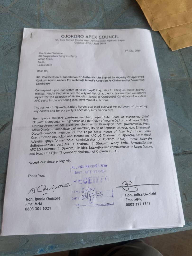 The latest letter titled “Re: Clarification and submission of authentic list signed by majority of approved Ojokoro apex leaders for Mobolaji Sanusi as chairmanship consensus candidate,” read: “Consequent upon our letter of yesterday (Friday, May 2, 2025) on above subject matter, kindly find attached the original list of authentic leaders that voluntarily signed for the adoption of Mr Mobolaji Sanusi as CONSENSUS Candidate of our dear APC party in the upcoming local government elections.