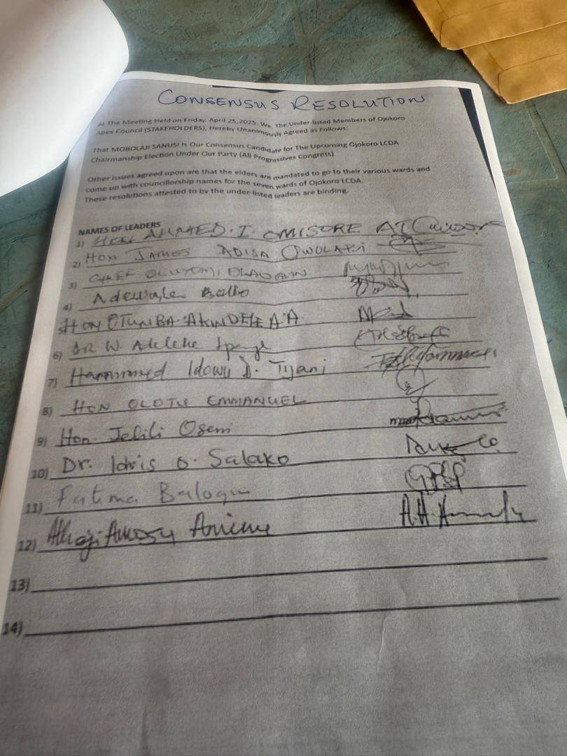 In a bid to corroborate their stance with irrefutable facts on the adoption of Mr Mobolaji Sanusi as consensus candidate of the All Progressives Congress (APC) in Ojokoro LCDA in the forthcoming local council elections in Lagos State, the party’s Ojokoro apex council has released a copy of the resolution containing names of the authentic leaders that signed for Sanusi.