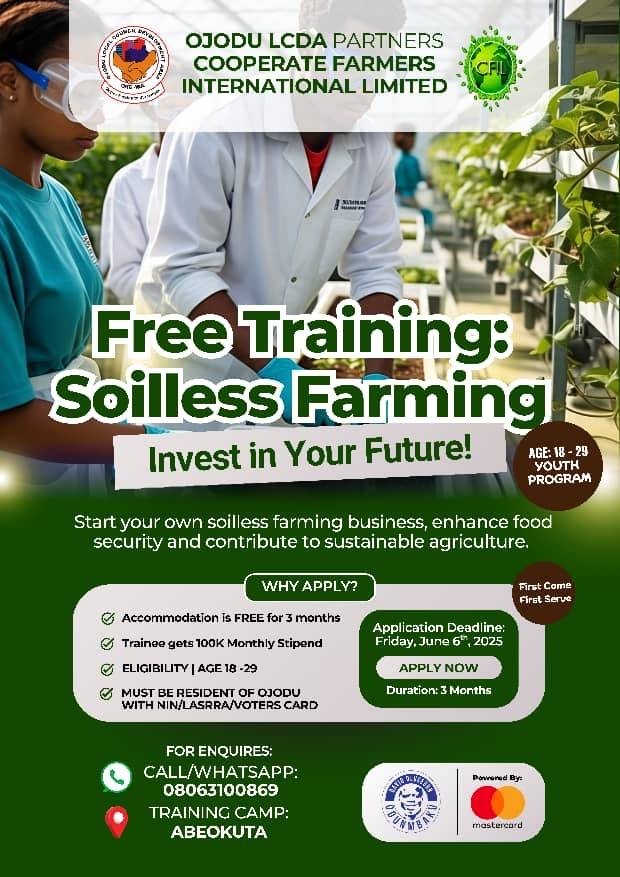 The training which is in conjunction with Soilless Farms will be held in Abeokuta, Ogun State for three months with the deadline for application fixed for Friday, 6th June 2025.